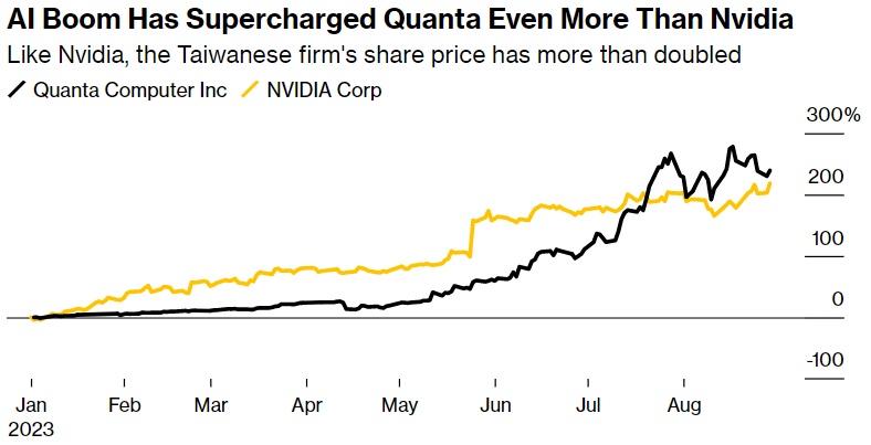 与英伟达合作打造人工智能服务器的广达电脑从华尔街押注人工智能技术将成为下一个大事件中受益匪浅。与其芯片制造合作伙伴英伟达一样,广达电脑的股价在2023年上涨了一倍以上。今年,广达电脑的人工智能加速器被视为人工智能技术的必备硬件。