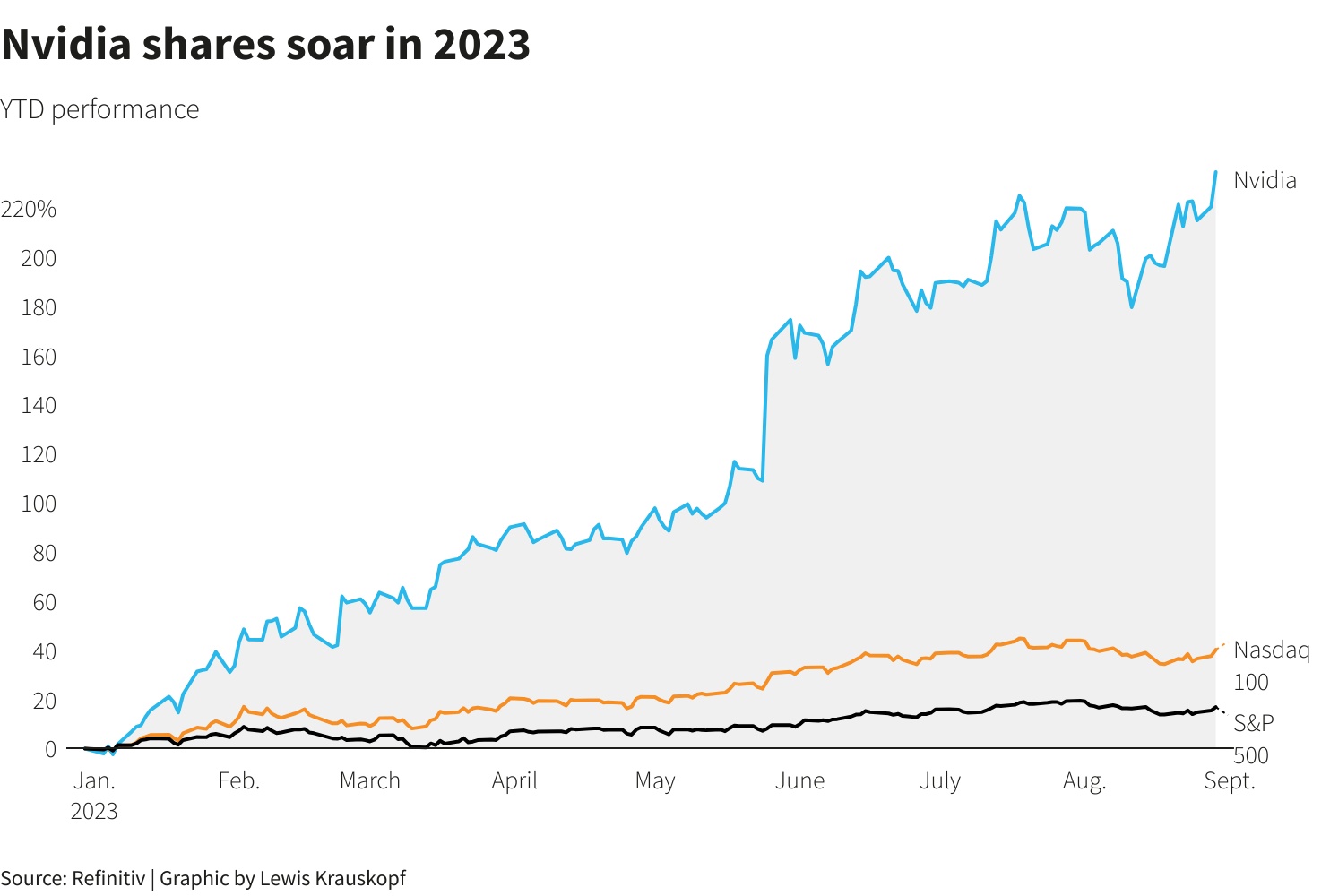 智通财经APP获悉,在人工智能热潮的推动下,英伟达(NVDA.US)今年迄今为止涨逾237%。然而,由于担心英伟达估值过高,许多基金持有的英伟达股票在投资组合中的占比与英伟达在基准股指中的权重相比较低,这使得它们难以跑赢基准股指。