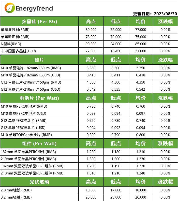 本周组件价格与上周持平,182单面单晶PERC组件主流成交价为1.21元/W,210单面单晶PERC组件主流成交价为1.23元/W,182双面双玻单晶PERC组件成交价为1.23元/W,210双面双玻单晶PERC组件主流成交价为1.24元/W。
