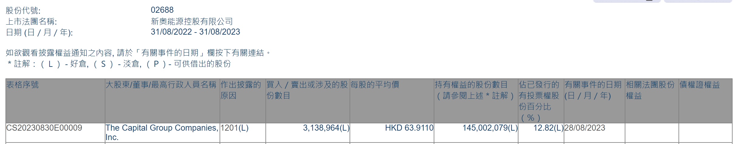 智通财经APP获悉,香港联交所最新资料显示,8月28日,美国资本集团减持新奥能源(02688)313.8964万股,每股作价63.9110港元,总金额约为2.01亿港元。减持后最新持股数目约为1.45亿股,最新持股比例为12.82%。