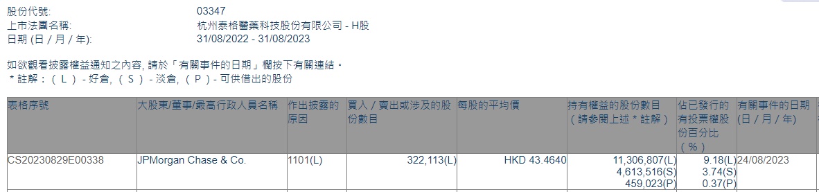 智通财经APP获悉,香港联交所最新资料显示,8月24日,小摩增持泰格医药(03347)32.2113万股,每股作价43.4640港元,总金额约为1400.03万港元。增持后最新持股数目约为1130.68万股,最新持股比例为9.18%。
