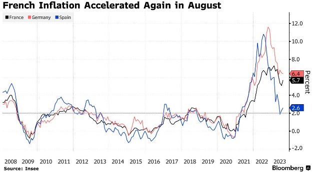 周三公布的数据显示,欧元区最大经济体德国8月份的通胀同比上涨6.4%,超过了经济学家调查中6.3%的中值预期。虽然西班牙的通胀率要低得多,为2.4%,但却是连续第二个月加速增长,而且基本指标仍然高得多。