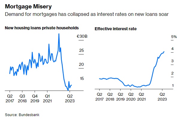 虽然为了缓解租赁市场的压力,德国已经制定了每年建造40万套新房的目标,但从目前的情况来看,目标能完成一半就很幸运了。上市房地产巨头Vonovia SE目前已停止所有新建项目,并且,由于减记了资产价值,该公司第二季度录得亏损20亿欧元(22亿美元)。瑞士卫浴产品供应商Geberit AG的老板本月早些时候告诉投资者:“德国的建筑指标尤其疲弱。”
