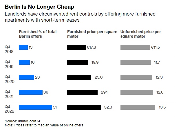 但相比之下,新租户往往被迫住在不受租金管制的公寓里——提供短期租赁的带家具公寓的业主有更大的自由调整租金。在柏林,带家具公寓现在占据了广告版面的大部分。新租户的租金也更有可能与通胀挂钩。数据提供商vdpResearch的数据显示,德国七个最大城市第二季度的新租金同比上涨6%。