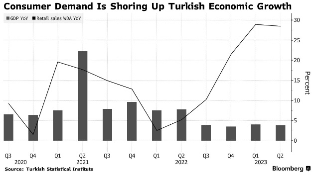 由于总统埃尔多安在选举前的巨额支出,整个5月份家庭消费保持强劲,经季节和工作日调整后的季度增长率急剧加快至3.5%。