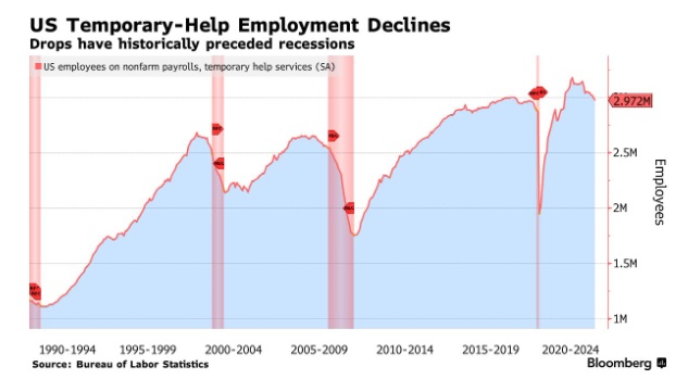 智通财经APP获悉,从历史上看,美国“临时支持服务”(Temporary-help)就业人数的变化通常预示着劳动力市场和经济的转折,而根据最新数据显示,该数字已连续六个月下降,这或许预示着未来经济将出现衰退。然而,一些业内资深人士对此却并不买账。