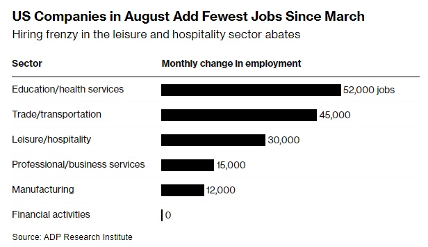 ADP研究所与斯坦福大学数字经济实验室周三联合发布的数据显示,随着休闲和酒店行业的招聘热潮消退,美国企业8月份新增就业岗位创下五个月来最低水平。