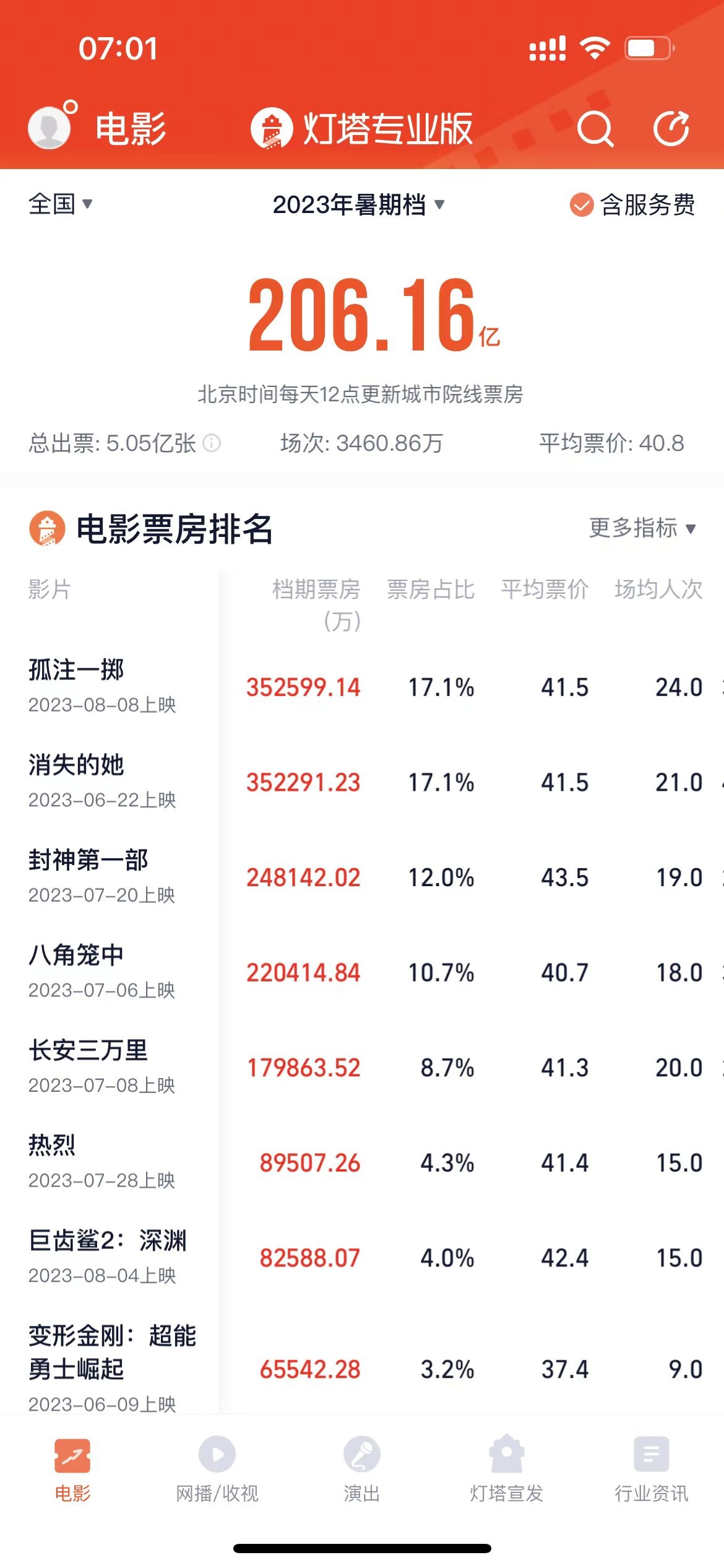 智通财经APP获悉,据灯塔专业版数据,截至8月31日,今年电影暑期档(6月1日-8月31日)总票房超206亿元,总观影人次突破5.05亿,总场次达3461万场。票房超20亿元的影片有4部,分别为《孤注一掷》、《消失的她》、《封神第一部》、《八角笼中》。上述数据均刷新中国影史暑期档纪录。