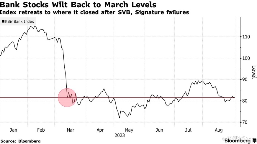智通财经APP获悉,KBW银行指数8月份下跌8.8%,创下春季美国地区银行危机爆发以来最糟糕的月度表现。该指数回到了3月份的水平,当时硅谷银行和签名银行突然倒闭后,恐慌笼罩了整个银行业。投资者对重新涌入美股银行股一直持谨慎态度,因为银行业正面临着越来越严格的监管和越来越高的存款成本,以及信贷(尤其是写字楼房地产)可能出现疲软。而在8月,评级机构下调一大批银行股评级以及美联储利率路径不确定性等因素加剧了投资者的担忧。