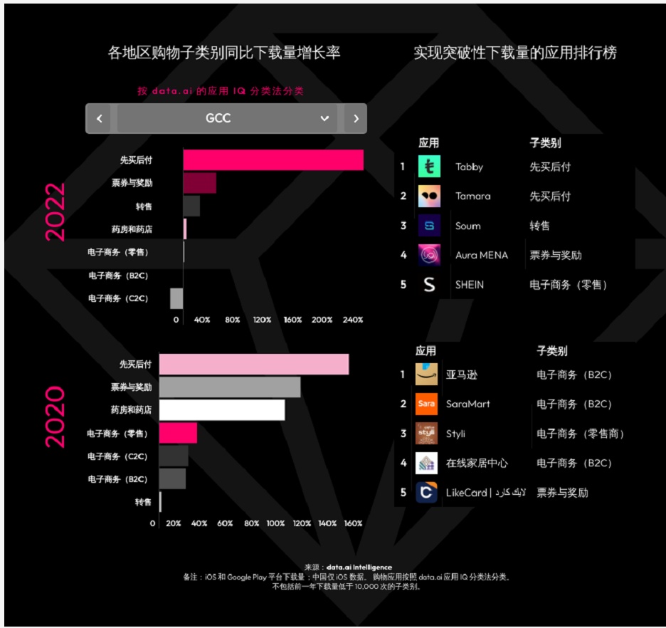 中东和北非地区消费者的移动购物习惯在疫情期间加速形成。2022年,消费者开始使用移动应用来提升购物性价比。在海湾合作委员会(GCC)国家(包括沙特阿拉伯、阿联酋、科威特、卡塔尔、阿曼和巴林)中,零售业增长最快的两个领域是"先买后付"(Buy-Now-Pay-Later,后续简称BNPL)和"优惠券与购物奖励"类应用,增长率分别为235%和43%。Tabby是BNPL领域的佼佼者,在沙特阿拉伯获得了强劲发展。随着海外企业将目光投向中东和北非市场,购物领域的竞争将变得尤为激烈——SHEIN是2022年GCC地区下载量最大的应用之一,这表明移动为先的商业模式已在该市场快速扩张。