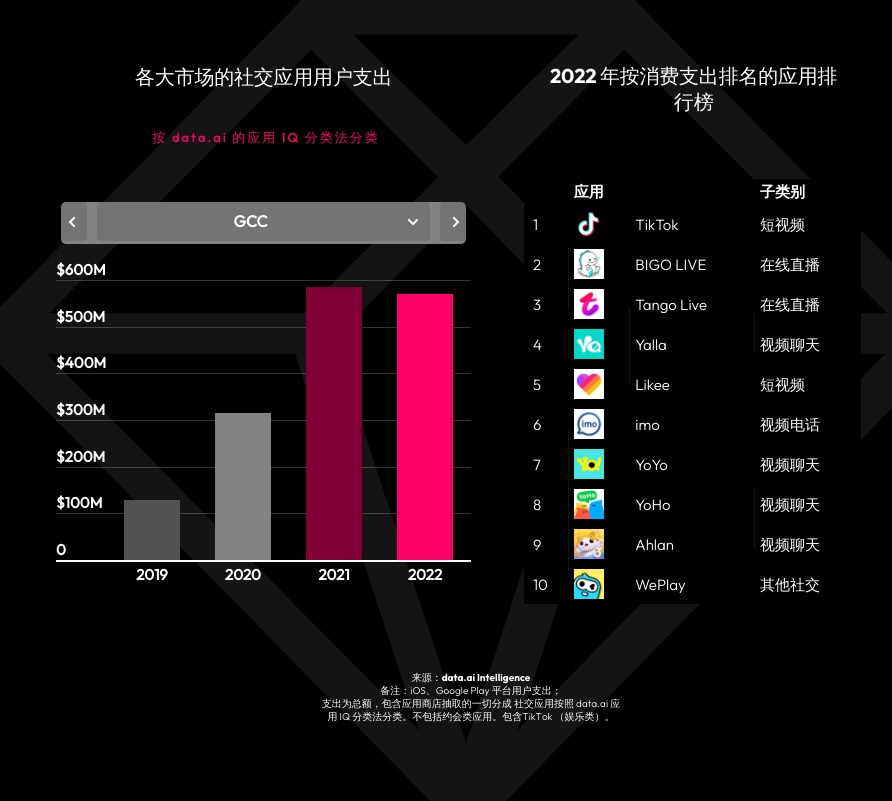 尽管2022年市场放缓,TikTok、BIGOLIVE和Tango Live等热门应用成功凭借疫情早期的收入,维持高额用户支出营收。在GCC国家中,沙特用户支出最高,占全球支出的近5%。2021年,这一比例攀升至近7%,于此同时,GCC国家支出也在这一年几乎翻了一番。