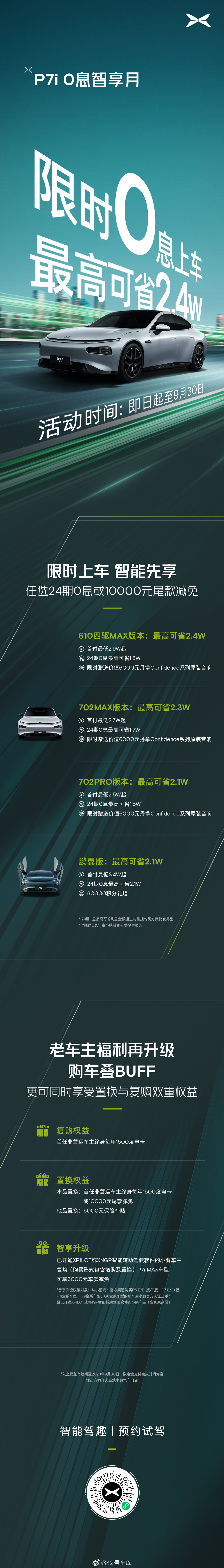 智通财经APP获悉,9月1日,小鹏汽车(09868)宣布,即日起至9月30日,小鹏汽车针对全新P7i全系车型开启限时购车优惠政策。消费者购车可任选24期0息或10000元尾款减免优惠购车方案,同时价值6000元的丹拿Confidence系列原装音响免费升级。换算下来,全新P7i四款车型换算优惠力度最高可省2.4万元。