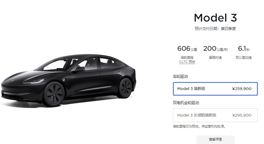 智通财经APP获悉,特斯拉(TSLA.US)发布新款Model 3,这是Model 3车型6年来的首次更新。新款Model 3外观更时尚,续航里程更长,但在中国的售价高于预期。官网显示,后轮驱动Model 3焕新版续航里程为606公里,在中国的起售价为25.99万元,比老款高出12%。老款Model 3的售价为23.19万元,续航里程为556公里。这款新车型已在中国、欧洲、中东和澳大利亚的所有网站上线,但仍未在美国上线。