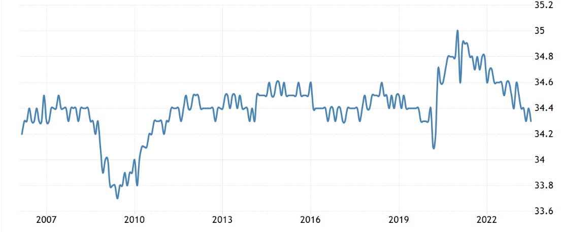 经济学家表示,雇主在大规模裁员之前会减少工人的工作时间,因此每周工时的下降趋势支持了劳动力市场正在减弱的论点。市场预计每周平均工作时间将保持在34.3小时不变。