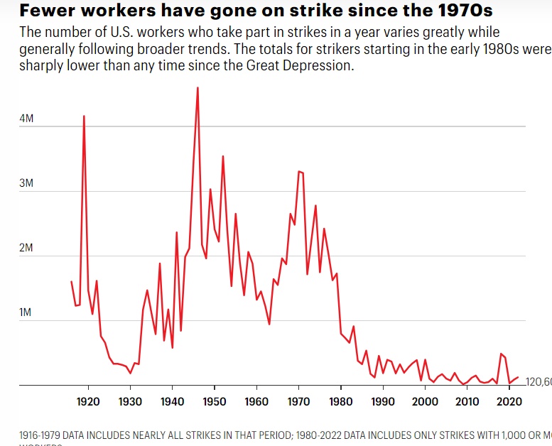 下面的图表显示了美国每年罢工的工人人数。请注意,在通货膨胀的20世纪70年代,每年有200万至300万工人罢工。这就是国际清算银行所警告的通胀危险,而我们似乎正在接近这个危险。
