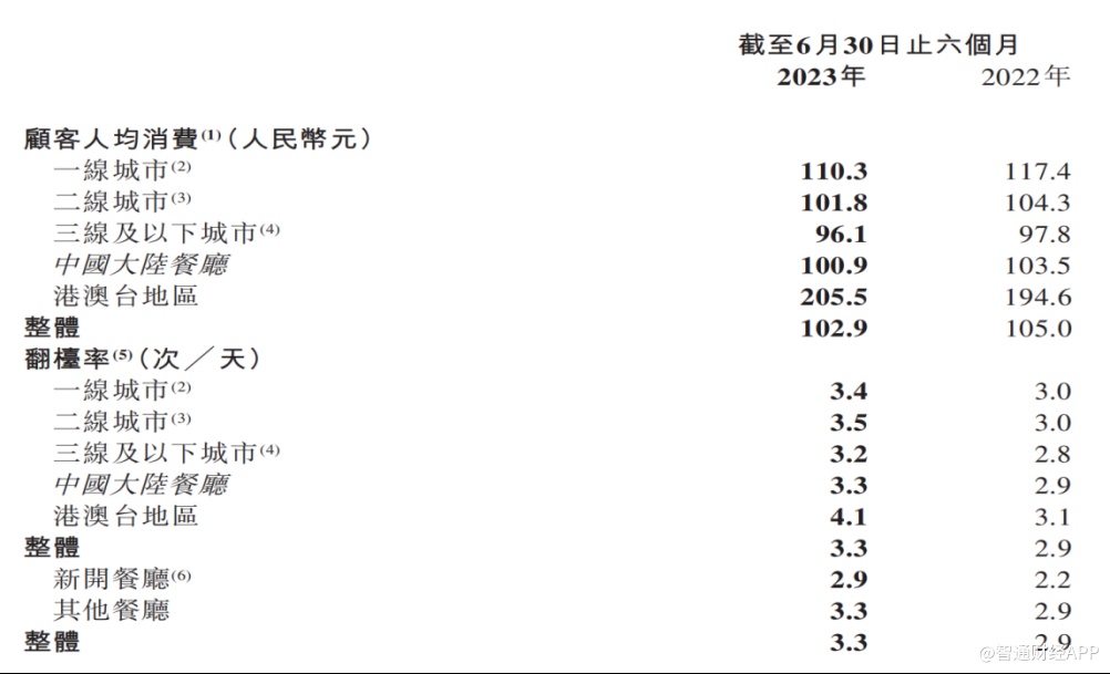 还有值得注意的一点是,从海底捞披露的翻台数据看,公司的变革也展现了良好的正外部性。截至2023年上半年,公司共经营1,382家海底捞餐厅,累计接待顾客人次达到约1.75亿。上半年,整体海底捞餐厅翻台率为3.3次/天,同店翻台率3.5次/天。期内,公司在各个区域的餐厅,日均翻台率均取得不同程度增长。