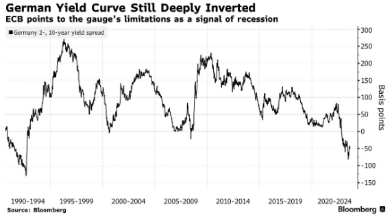 欧洲央行在其报告中承认,欧元区收益率的倒挂“重新引发了市场参与者对经济衰退的担忧”,尤其是考虑到这种走势的过往记录。