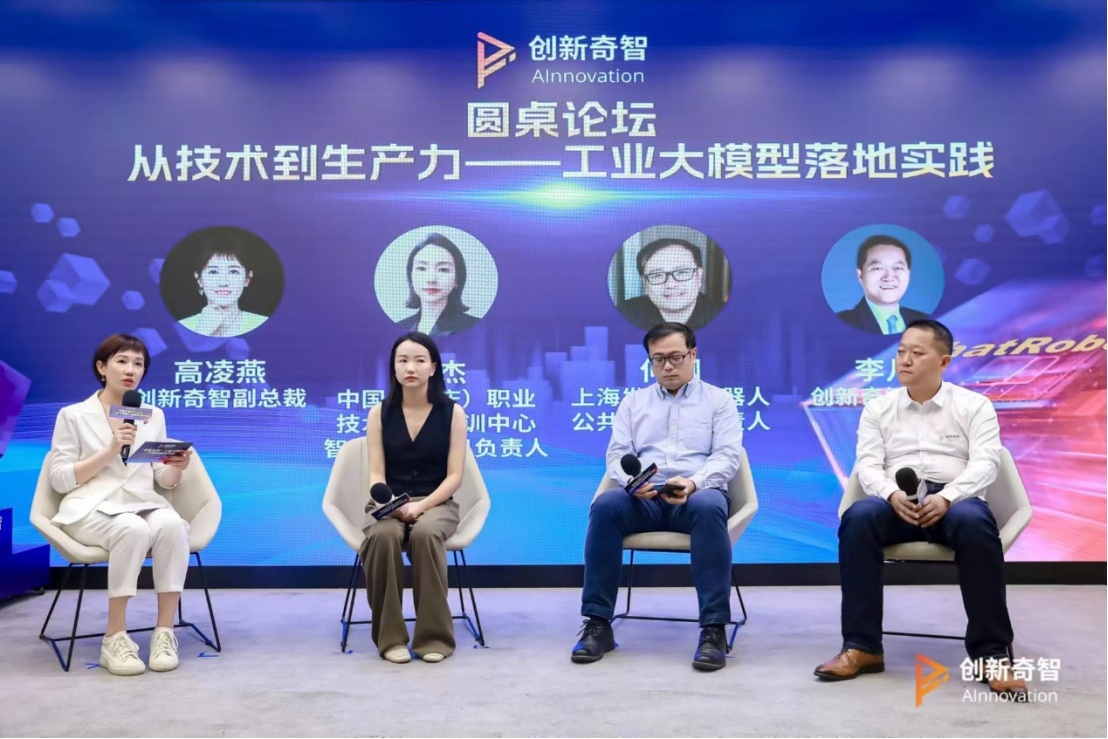 在圆桌论坛环节,创新奇智副总裁高凌燕与创新奇智CPO李凡、中国(重庆)职业技术公共实训中心智能制造项目负责人杨杰、上海发那科机器人有限公司公共教育科负责人何炯等嘉宾共同探讨了AI2.0时代,大模型之于工业制造的价值与应用潜力。