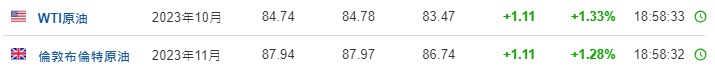 3. 截至发稿,WTI原油涨1.33%,报84.74美元/桶。布伦特原油涨1.28%,报87.94美元/桶。