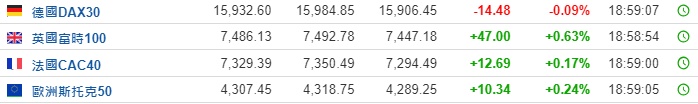 2. 截至发稿,德国DAX指数跌0.09%,英国富时100指数涨0.63%,法国CAC40指数涨0.17%,欧洲斯托克50指数涨0.24%。