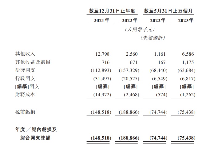 财务方面,于2021年、2022年以及2022年、2023年截至5月31日止五个月,该公司实现其他收入分别约1279.8万元、256万元、116.1万元、658.6万元,录得亏损及综合开支总额人民币约1.49亿元、1.89亿元、7474.4万元、7543.8万元。