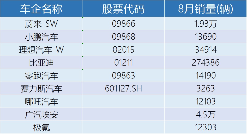 智通财经APP获悉,9月1日,新能源车企陆续交出成绩单。8月,蔚来-SW(09866)交付1.93万辆汽车,同比增长81.0%;小鹏汽车(09868)共交付新车13690台,同比增长43%;理想汽车-W(02015)共计交付新车34914辆,同比增长663.8%;比亚迪(01211)销量274386辆;零跑汽车(09863)8月交付14190台;赛力斯汽车(601127.SH)销量3263辆,同比下降67.52%;哪吒汽车全系交付12103台,环比增长20.56%;广汽埃安销售4.5万辆,终端交付5.2万辆,环比增长15.62%;极氪交付12303辆,同比增长71.7%,环比增长2.19%。