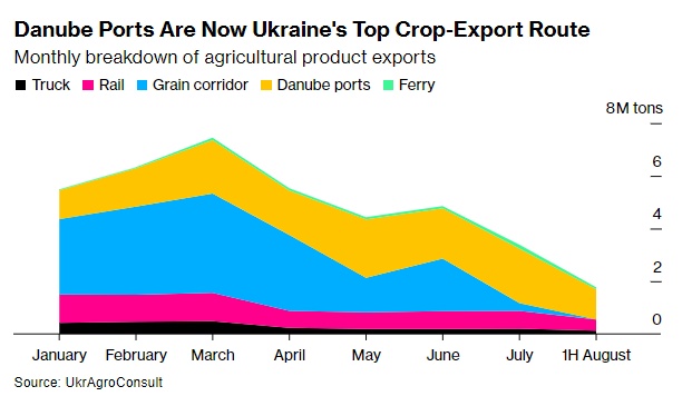 据悉,自7月俄罗斯退出了黑海粮食外运协议,导致黑海港口关闭以来,多瑙河已成为乌克兰的主要粮食出口通道。