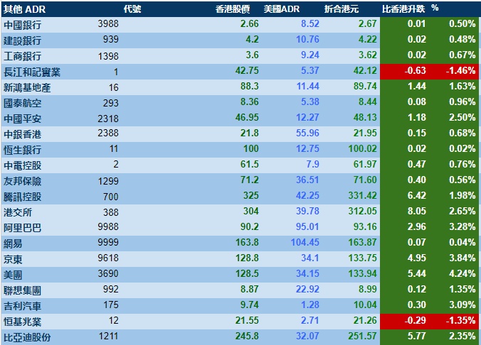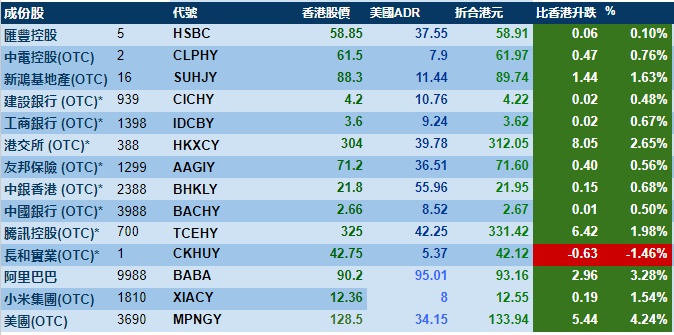智通财经APP获悉,周五美股三大指数涨跌不一,港股ADR指数上涨,按比例计算,收报18621点,较香港收市涨238.62点或1.28%。
