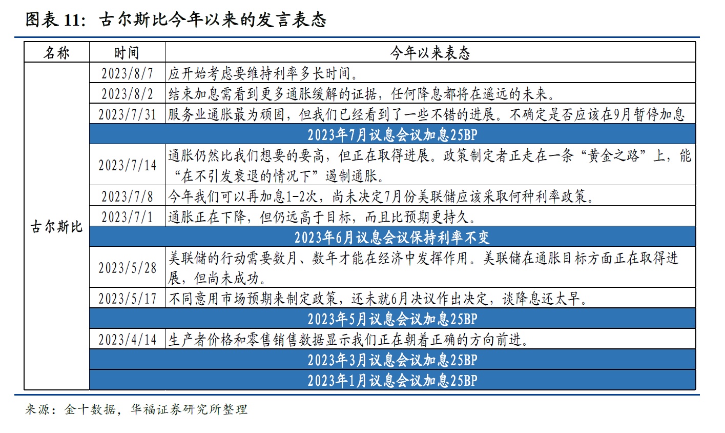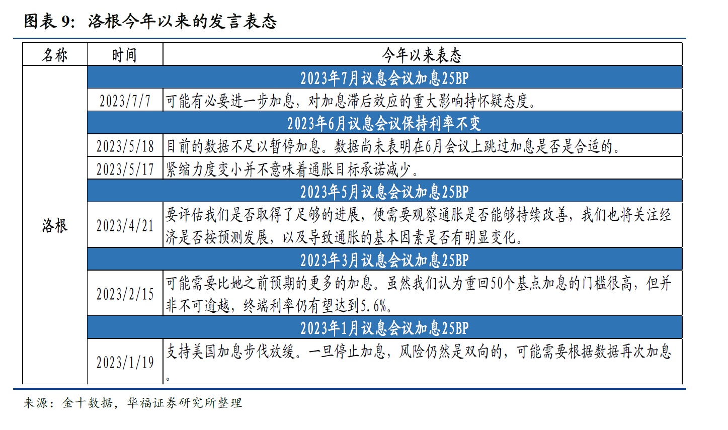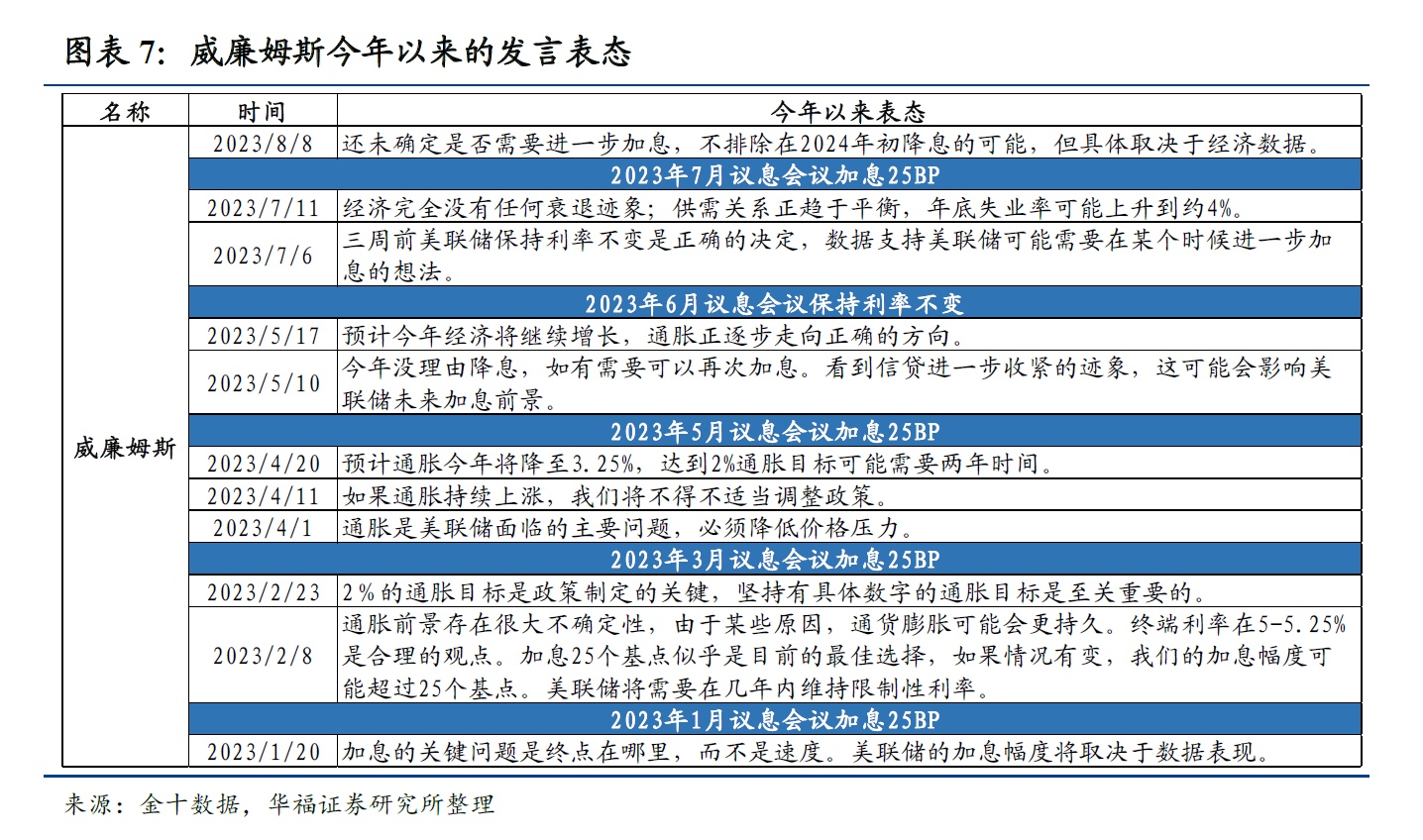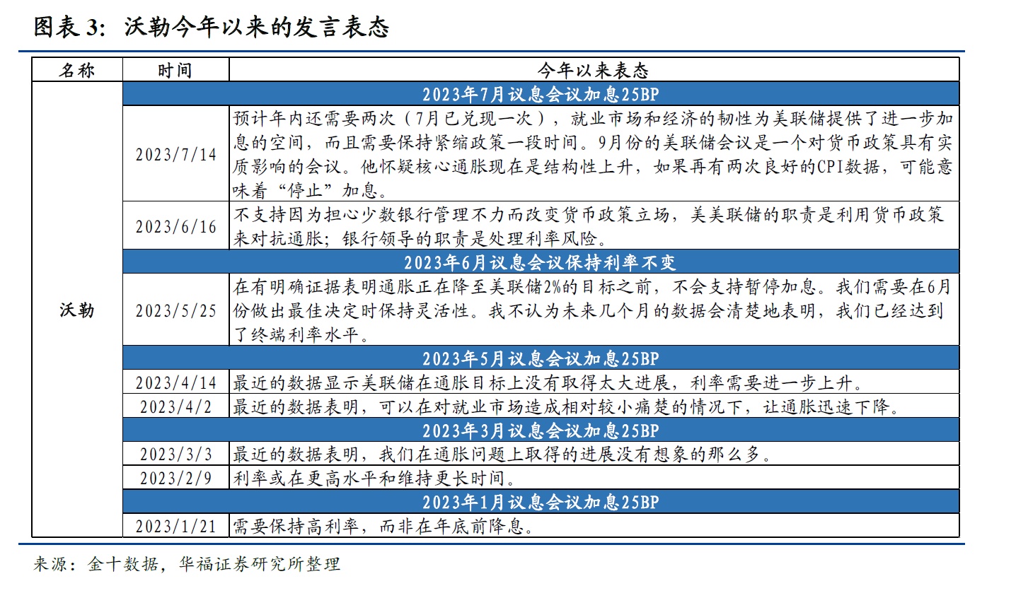 值得注意的是,鹰、鸽属性并不是固定不变的,美联储官员在货币政策决策中会根据实际情况和数据来做出决策,例如沃勒在2019年的加息中表现为鸽派,沃勒认为美联储不应该在当时(2019年)加息,而在2022年的本轮加息周期中,沃勒表现的态度是鹰派,因此表中的鹰、鸽派系分类是针对本轮加息周期。