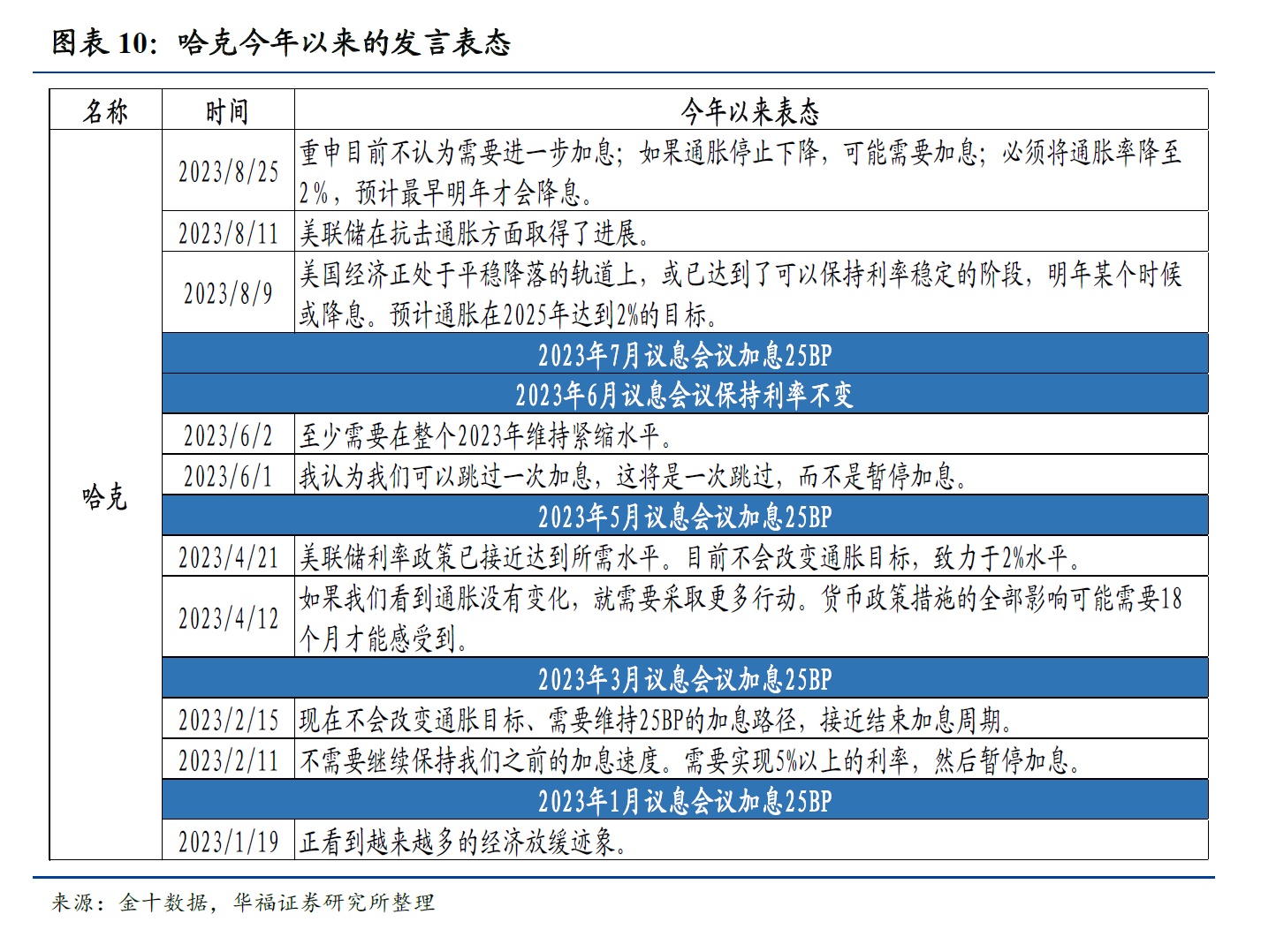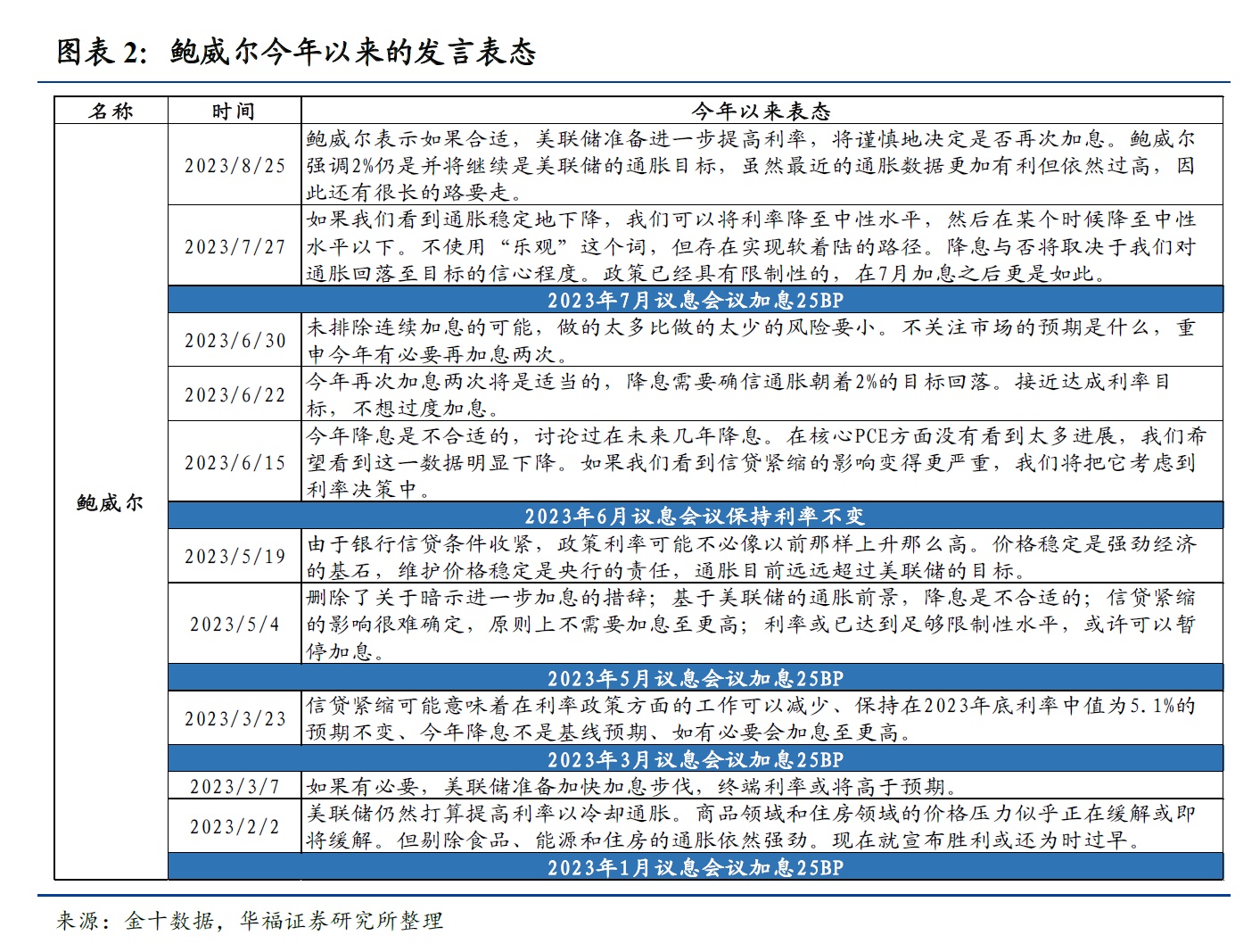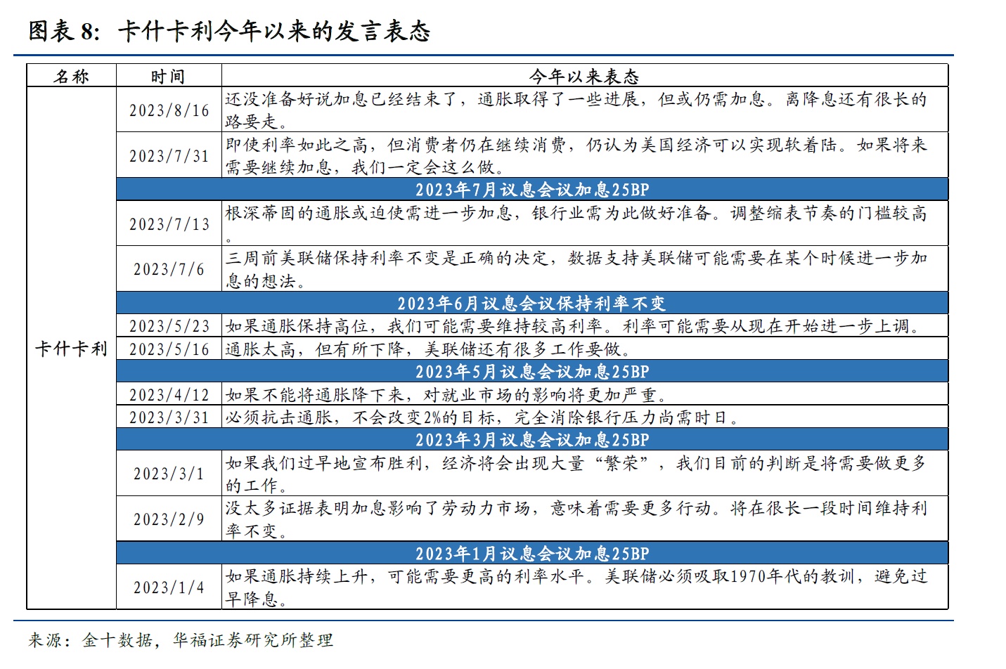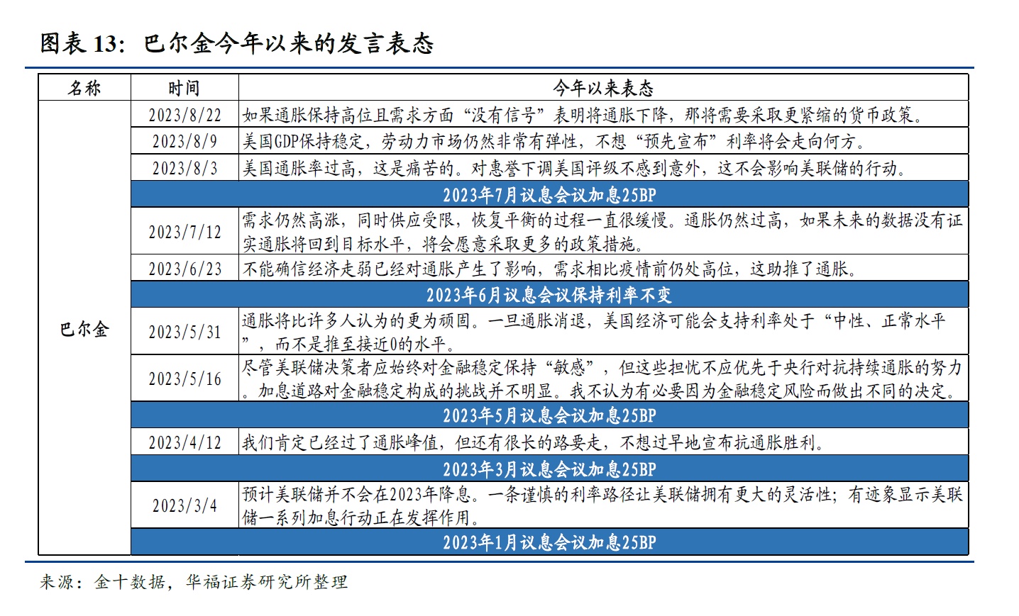 值得注意的是,鹰、鸽属性并不是固定不变的,美联储官员在货币政策决策中会根据实际情况和数据来做出决策,例如沃勒在2019年的加息中表现为鸽派,沃勒认为美联储不应该在当时(2019年)加息,而在2022年的本轮加息周期中,沃勒表现的态度是鹰派,因此表中的鹰、鸽派系分类是针对本轮加息周期。