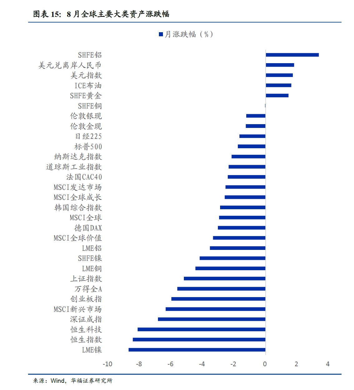 8月全球主要大类资产多为下跌。SHFE铝(3.38%)涨幅最大,美元兑离岸人民币(1.80%),美元指数(1.72%),ICE布油(1.63%),SHFE黄金(1.45%)涨幅居前。LME镍(-8.72%)跌幅最大,恒生指数(-8.45%),恒生科技(-8.14%),深证成指(-6.85%)跌幅居前。