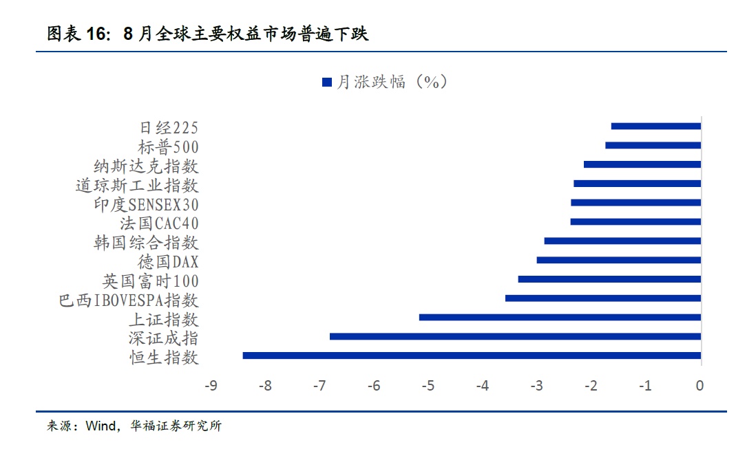 8月全球主要权益市场普遍下跌。其中,恒生指数(-8.45%)跌幅最大,深证成指(-6.85%),上证指数(-5.20%),巴西IBOVESPA指数(-3.61%),英国富时100(-3.38%)跌幅居前。