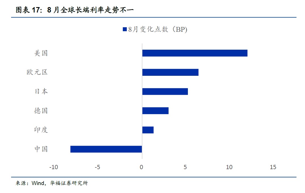 8月全球长端利率走势不一。10年期国债收益率中,美国从3.97%上涨12BP至4.09%,欧元区从2.5434%上涨6.42BP至2.6076%,日本从0.605%上涨5.2BP至0.657%,德国从2.52%上涨3BP至2.55 %,印度从7.17%上涨1.3BP至7.19%,;中国从2.6716%下跌8.18BP至2.5898%。