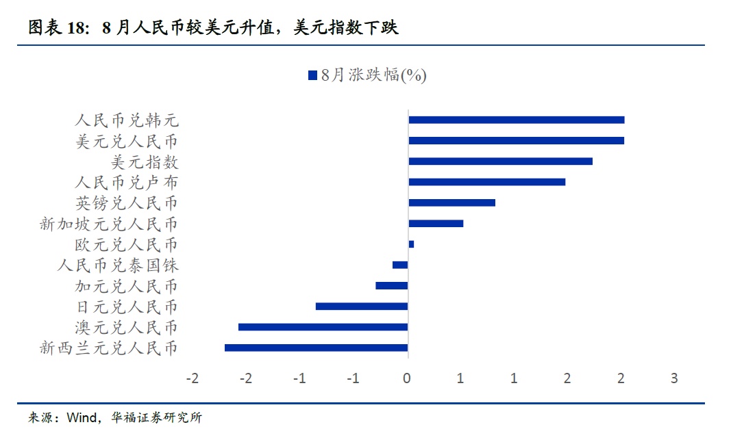 8月美元较人民币升值,美元指数上涨。美元(2.01%),英镑(0.81%),新加坡元(0.51%),欧元(0.05%)相较人民币升值;新西兰元(-1.72%),澳元(-1.59%),日元(-0.87%),加元(-0.31%)相较人民币贬值。此外,人民币兑韩元上涨2.02%,美元指数上涨1.72%,人民币兑卢布上涨1.47%,人民币兑泰铢下跌0.15%。