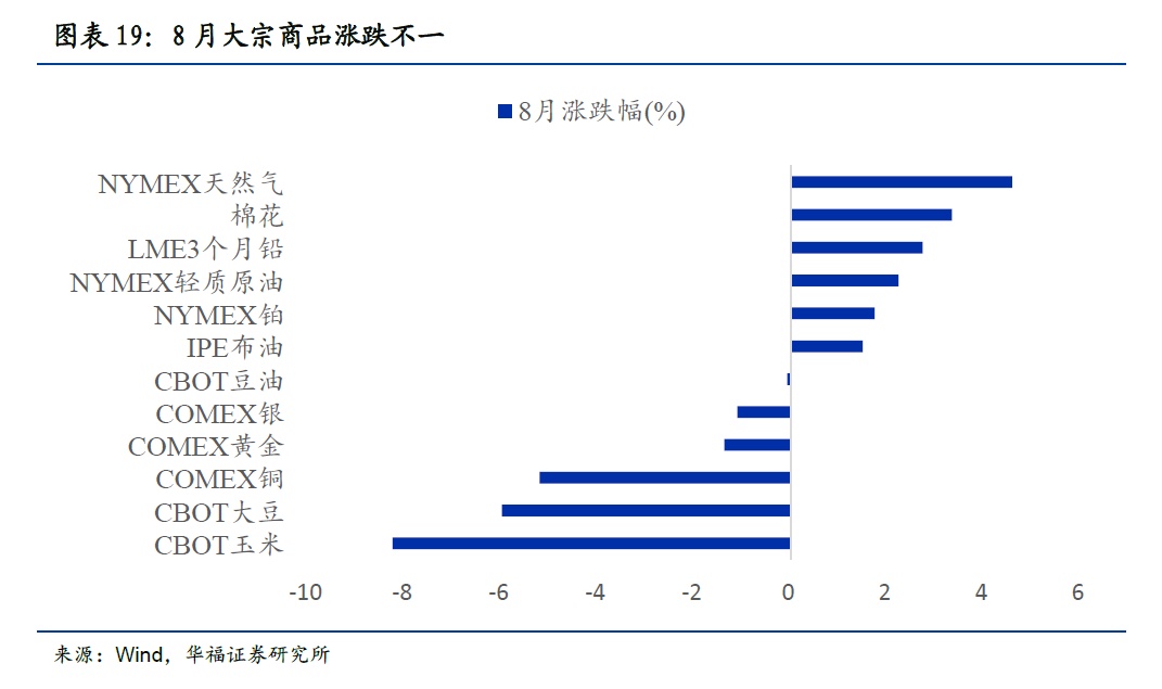8月大宗商品涨跌不一。NYMEX天然气(4.58%)涨幅最大,棉花(3.33%),LME3个月铅(2.73%),NYMEX轻质原油(2.23%),NYMEX铂(1.73%),IPE布油(1.48%),涨幅居前。CBOT玉米(-8.25%)跌幅最大,CBOT大豆(-5.99%),COMEX铜(-5.21%),COMEX黄金(-1.38%)有所下跌。