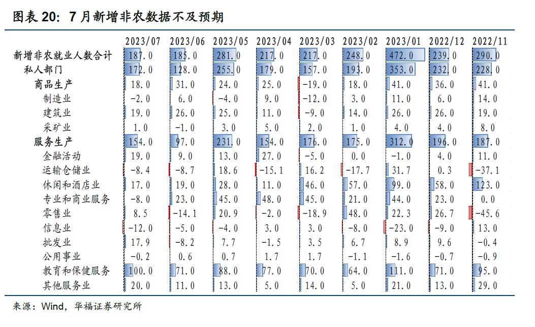 美国平均薪资增速保持韧性,可能带来“薪资-通胀”的螺旋上升,提高了加息终点进一步抬升的可能性。美国劳工统计局(BLS)公布的7月新增非农就业人数为18.7万人,不及市场预期的20万人,前值由新增20.9万人下修至18.5万人。但同时,美国7月失业率为3.5%,低于前值3.6%,仍处于较低位置。具体详见《就业市场略降温,但韧性犹在——美联储7月非农就业数据点评》。