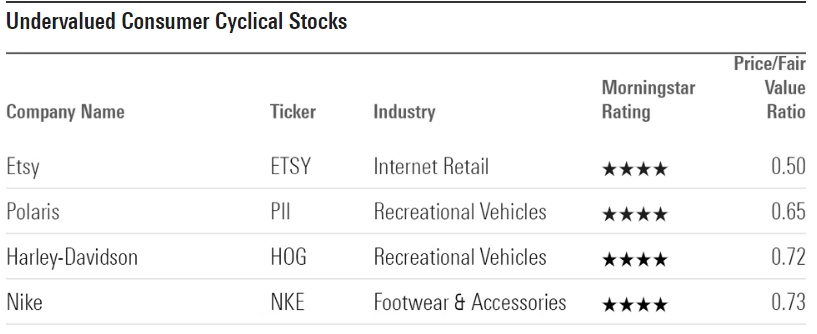 晨星表示,这其中最被低估的股票是Etsy,其交易价格比晨星分析师们预估的公允价值估计低50%。被低估程度相对较低的是耐克(Nike),其股票交易价格被低估大约27%。