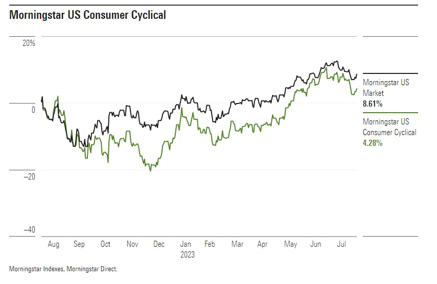 从今年全年来看,截至8月24日,周期性消费指数在2023年上涨了28.1%,而晨星编制的美国市场指数仅上涨了16.4%。