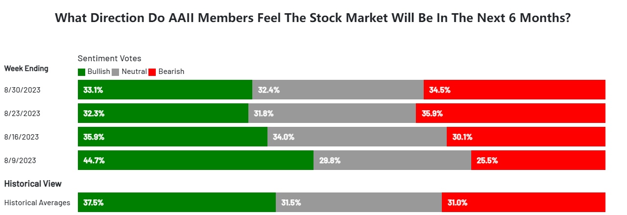 美国个人投资者协会(AAII)备受关注的散户信心调查数据显示,截至8月30日的这一周,看空美股的散户投资者比例较8月初回升,看空后市的散户人数比例接近35%,且看空比例高于历史平均数据。而截止8月23日当周的看空人数则是自6月以来首次超过看多后市的散户人数比例。
