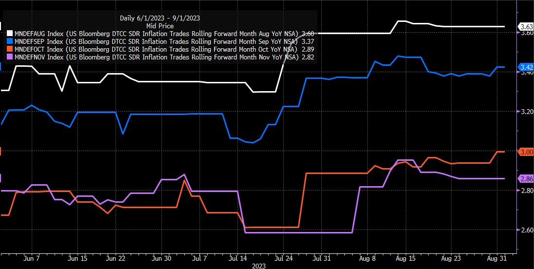 另一个重要因素是,近期油价飙升,已升至每桶86美元,这意味着随着汽油价格上涨,CPI掉期定价推高了未来几个月的通胀前景。8月份的CPI预期升至3.6%,9月份升至3.4%,10月份升至3%。考虑到去年这个时候的通胀率,这些听起来不像是有意义的举措。然而,只有在油价继续攀升的情况下,这些CPI预期才会上升。而整体通胀在美联储2%的目标上方停留的时间越长,美联储将不得不把利率维持在较高水平的时间就越长,美联储需要采取更多行动的风险也就越大。