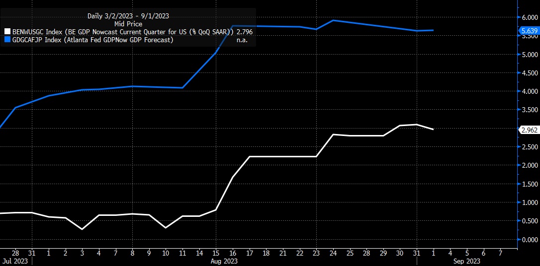 美国经济确实出现了一些放缓迹象,然而,总体来看,经济仍然强劲,表明市场可能会延续之前的趋势,即推高收益率曲线的远端利率,并重新买入美元。毕竟,亚特兰大联储GDPNow和彭博即时预测(Bloomberg Nowcast)等经济模型表明,在大量数据发布后,第三季度的实际GDP预期几乎没有变化。而根据最新的数据,亚特兰大联储GDPNow模型预计美国第三季度GDP高达5.9%,此前预计为5.8%。
