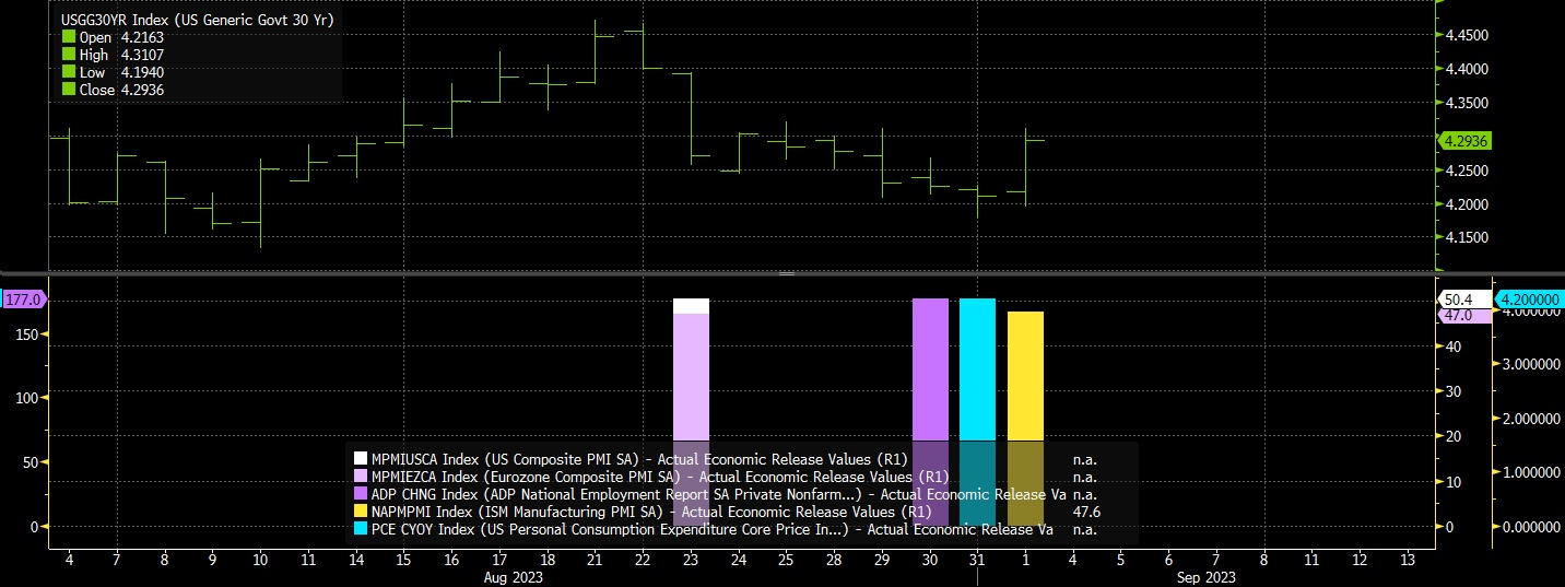 美国股市再次回到“坏消息就是好消息”的局面,因为交易员们认为,一旦经济增长出现大幅放缓迹象,美联储就会出手拯救股市。“坏消息带来好消息”始于8月23日,当天公布的Markit欧洲和美国8月PMI初值疲弱,大幅拉低了名义利率。然后,在过去的一周,较弱的职位空缺数据(JOLTS)和低于预期的“小非农”——ADP就业人数(尽管7月份的数据被大幅向上修正)再次导致利率下降。但上周四,如预期的核心个人消费支出数据(PCE)和火热的(除住房外)核心PCE服务通胀数据帮助利率企稳,然后利率在上周五的非农就业数据强于预期和美国8月ISM制造业PMI强于预期后走高。