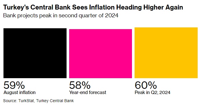 智通财经APP获悉,土耳其通胀加速至今年最高水平,突显出土耳其央行在加息以试图结束生活成本危机之际面临的挑战。土耳其统计局的数据显示,随着食品和能源价格的上涨,8月份物价同比涨幅从7月份的近48%飙升至58.9%,市场此前预期为55.9%。
