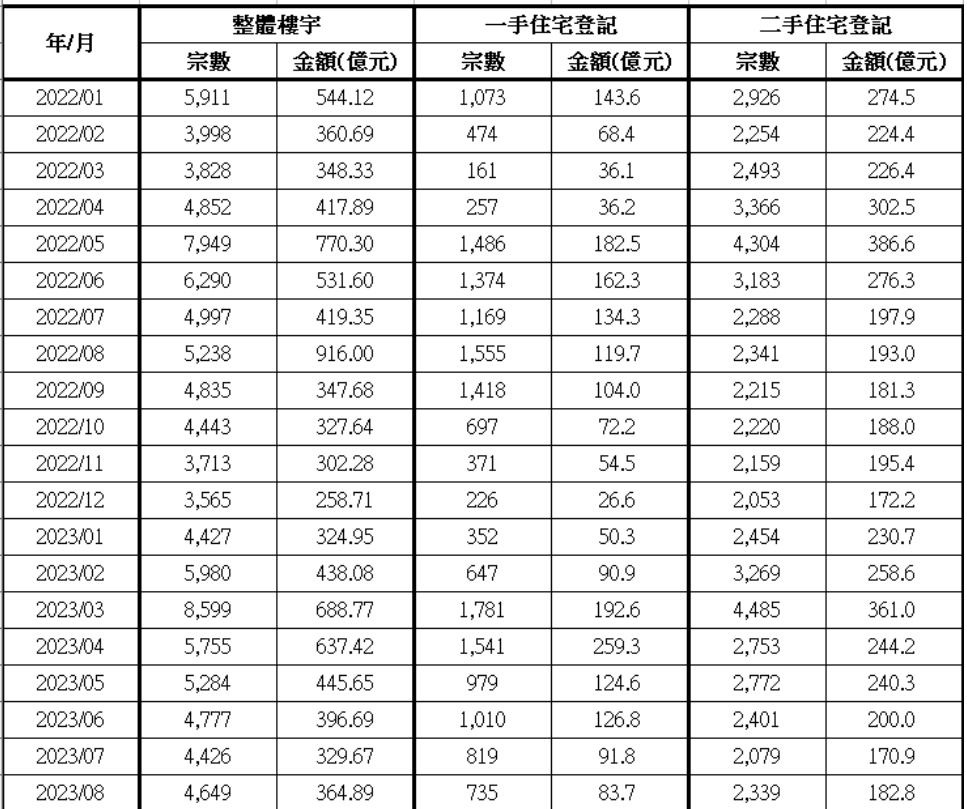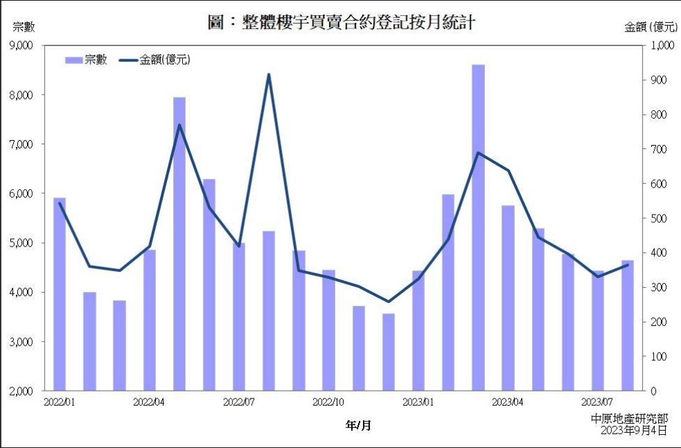 香港二手私人住宅方面,8月份录2339宗及182.8亿港元,较7月的2079宗及170.9亿港元,分别上升12.5%及7.0%,但宗数及金额仍为2022年12月后的近8个月次低。二手拉锯局面持续,买卖于二千宗左右低位徘徊。