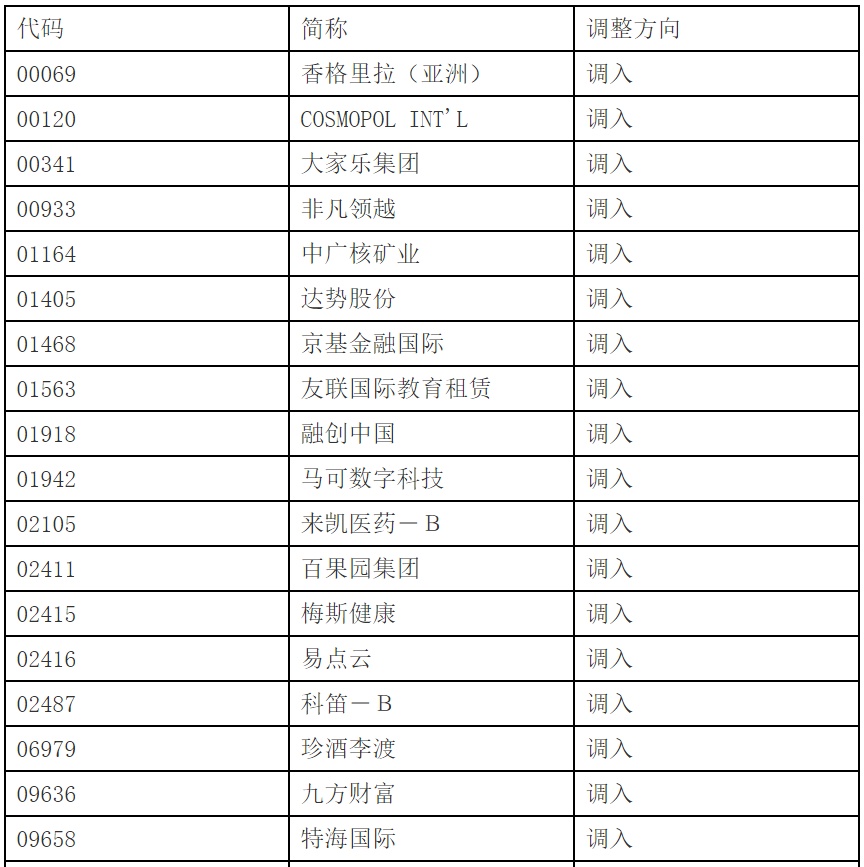 智通财经APP获悉,9月5日,据上交所、深交所公告,根据《上海证券交易所沪港通业务实施办法》、《深圳证券交易所深港通业务实施办法》的有关规定,沪、深港通下港股通标的名单发生调整,并自2023年9月5日起生效。其中融创中国(01918)、珍酒李渡(06979)、来凯医药-B(02105)等22股获纳入。除此之外,调出港龙中国地产(06968)、香港航天科技(01725)、金阳新能源(01121)等24股。