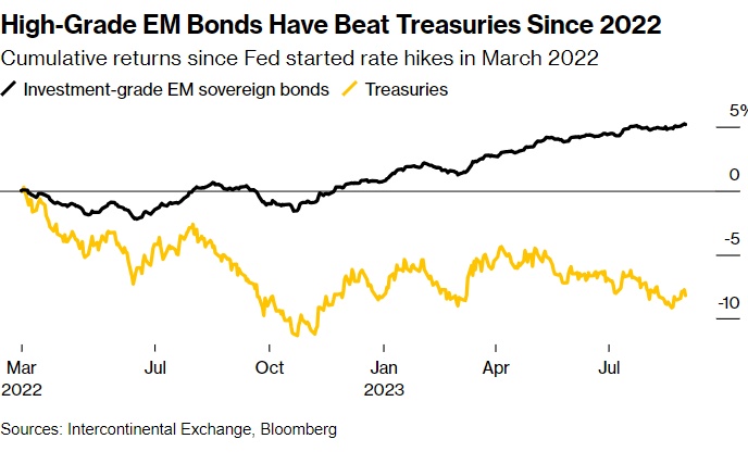 自2022年以来,新兴市场高评级债券的表现一直优于美国国债——自美联储2022年3月开始加息以来的累计回报率对比
