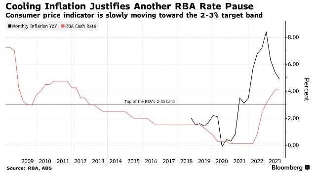 与大多数主要同行相比,澳洲联储的加息速度较慢,反映出加息对主要依靠浮动利率抵押贷款的澳大利亚借款人的迅速传导影响。他的判断是加息4个百分点,而美联储的加息幅度为5.25个百分点,这一判断似乎得到了回报,目前通胀正在稳步降温。