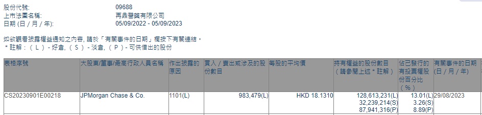智通财经APP获悉,香港联交所最新资料显示,8月29日,小摩增持再鼎医药(09688)98.3479万股,每股作价18.1310港元,总金额约为1783.15万港元。增持后最新持股数目约1.29亿股,最新持股比例为13.01%。