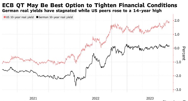 瑞穗利率策略师Evelyne Gomez-Liechti表示,欧洲央行将开始考虑调整量化紧缩(QT)政策,即缩减资产负债表的过程,即使政策制定者下周会再次加息。她说:“加速QT肯定有助于政策进一步正常化,并看到长期利率进一步上升。我认为,他们将采用微调和更长时间维持较高利率的组合。”