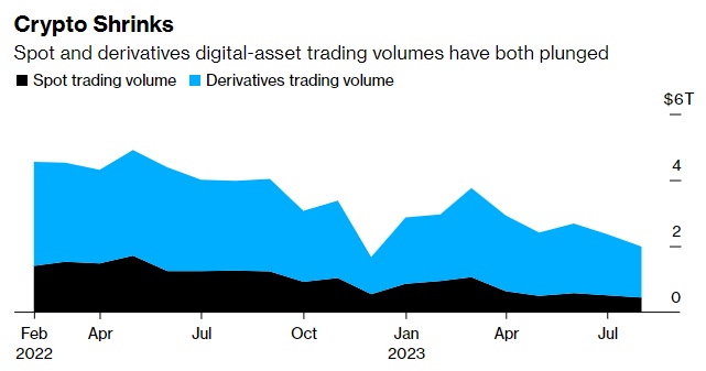 CCData显示,与2022年1月相比,8月份集中式交易所的月度现货交易量下降了74%,至4450亿美元。除了现货代币,做市商还在更大的数字资产期货和期权领域开展业务。加密衍生品的交易量也有所下降,同期约减半至1.5万亿美元。